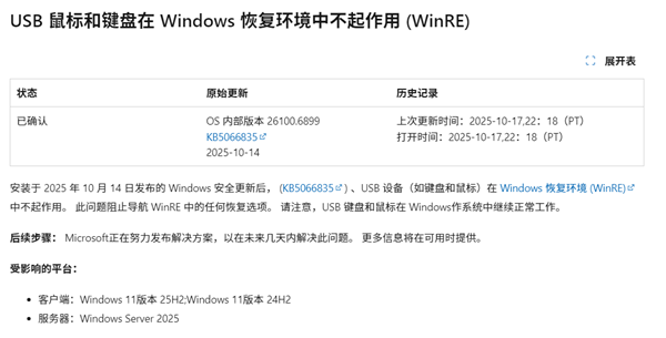 "安装2025年10月14日发布的Windows安全性更新(KB5066835)后,USB设备(例如键盘和鼠标)在Windows还原环境(WinRE)中无法运行,此问题导致WinRE中的任何还原选项都无法使用。"