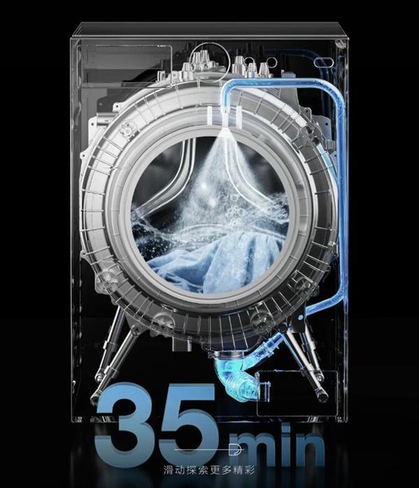 搭载循环喷淋系统,洗涤时抽取筒底精华液均匀喷洒,重复浸透衣物纤维,瓦解污渍,号称35分钟实现60分钟洗涤效果。