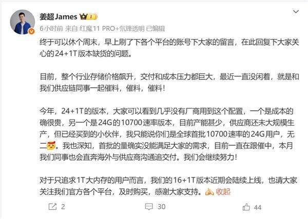 几乎所有厂商都放弃了24G+1T版本 红魔姜超:成本太贵 产能很少