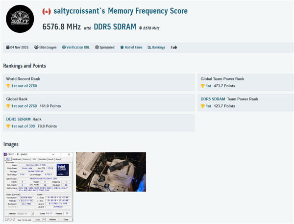 Saltycroissant使用了一根24 GB Corsair Vengeance DDR5内存条,搭配GIGABYTE Z890 AORUS Tachyon ICE主板和Intel Core Ultra 7 265K CPU,成功将内存频率推向了新的高度。