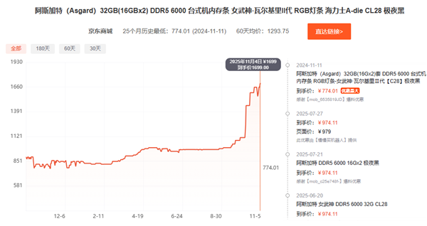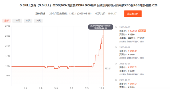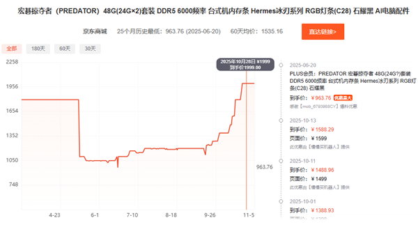京东上随便找了几款热销的内存条,基本都是如此,比如芝奇皇家戟32GB DDR5-6000已经卖到2500元,宏碁冰刃48GB DDR5-6000涨至2000元,阿斯加特女武神瓦尔基里32GB DDR5-6000也要1700元,比两个月前贵了足足100%甚至更多。