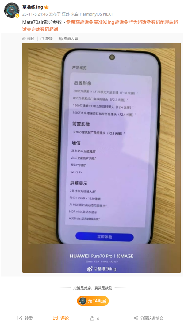 史上最薄Mate直板机!华为Mate70 Air正式官宣:今日预售