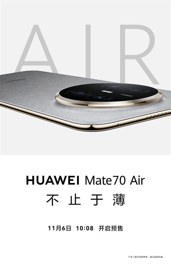 11月6日消息,华为Mate70 Air今天正式公布,将于10:08正式开启预售,官方定义"不止于薄"。
