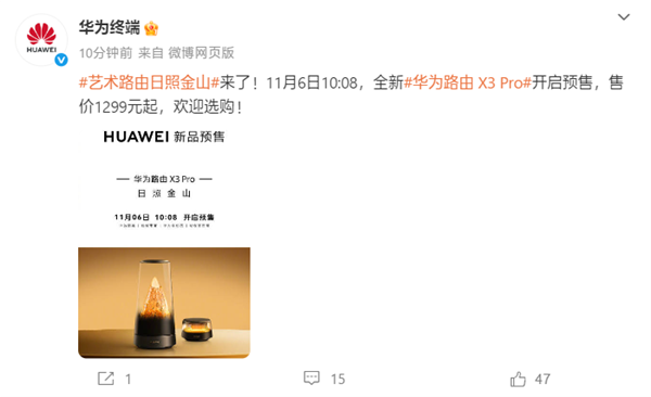 11月6日消息,华为路由X3 Pro日照金山今天官宣开启预售,官方将其称之为"艺术路由"。