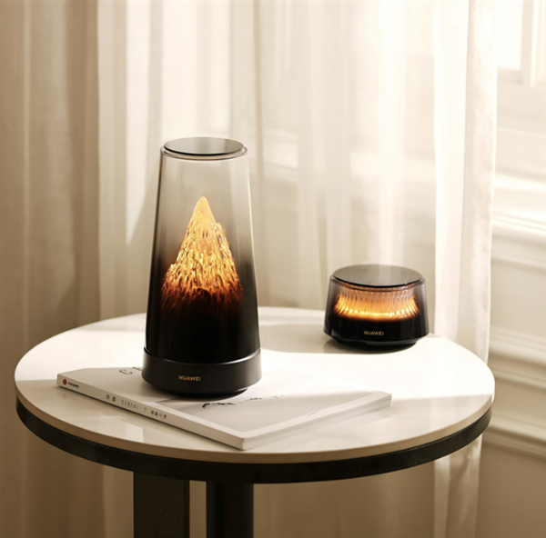 该路由主体采用柱形渐变透明外壳,里面是一个会发光的山峰饰品,纯黑底座印有金色的HUAWEI Logo。