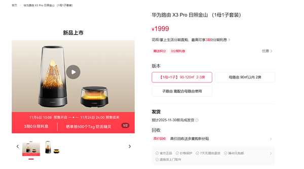 据了解,华为路由X3 Pro日照金山售价1299元起,其中,母路由售价1299元,子路由售价799元,一母一子套装价格为1999元。