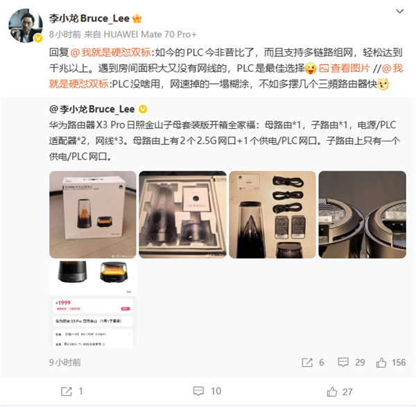 李小龙晒华为路由X3 Pro日照金山开箱:PLC是没网线的大户型最佳选择