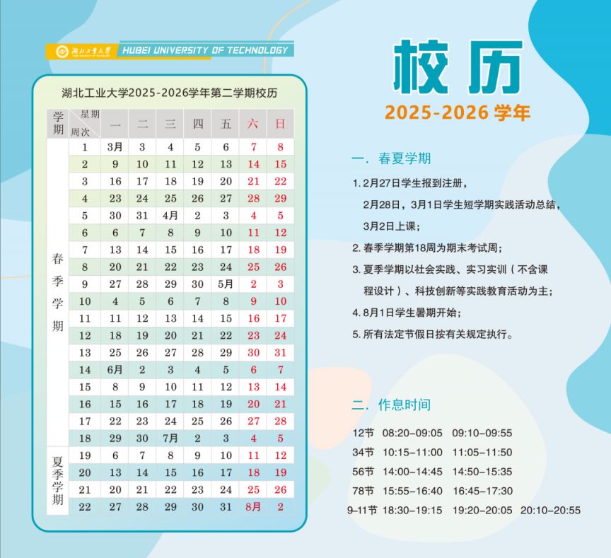 【导语】:2025-2026湖北工业大学校历公布了,2026年1月24日学生寒假开始,2026年8月1日学生暑假开始。