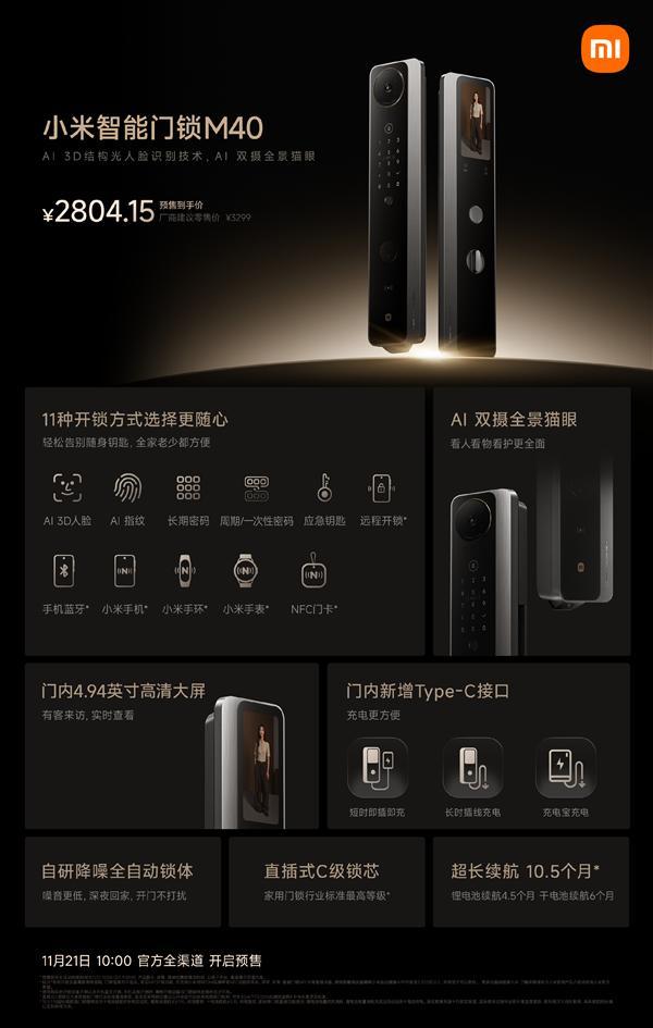 11月21日消息,小米智能生态官宣智能门锁M40正式开售,官方定价3299元,国补到手价2804.15元。