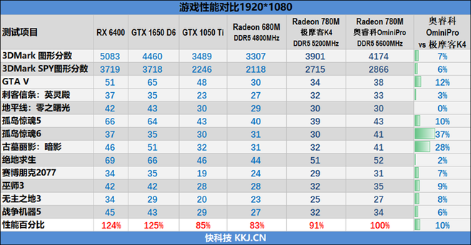 和独显相比,奥睿科OminiPro的性能已经超越GTX 1050 Ti,领先幅度约为18%。与RX 6400和GTX 1650 D6这样的独显相比,差距也只有25%左右。