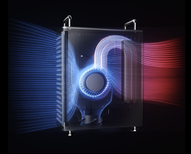 主机内部设计了一套立式"黑鲸"涡轮散热系统,内置双涡轮静音风扇,形成了立式贯穿式风道,再加上全铝机身,散热效果相比常见的平躺式迷你主机大幅提升,满载一小时也能将噪音控制在35dB以内。