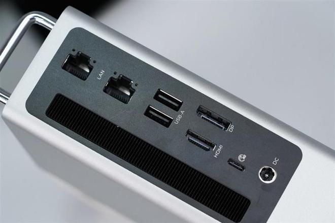 右边是一排I/O接口从上到下依次是2x2.5Gbps网口,2xUSB 2.0接口、1xDP 1.4、1xHDMI 2.1、1x40Gbps USB 4.0接口以及一个DC电源插孔。