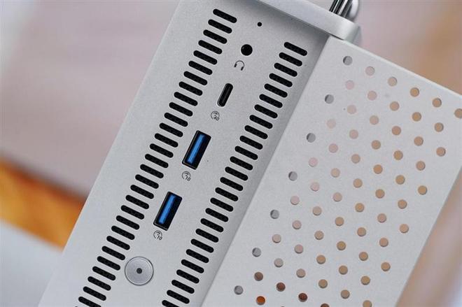 从上到下依次是3.5mm耳麦合一接口、40Gbps USB 4.0接口、2x10Gbps USB-A接口、电源按钮。