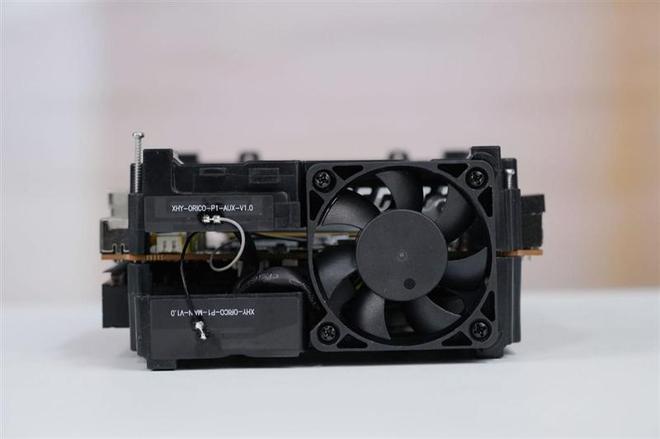 拆开外壳,可以看到底部有一个风扇贯穿PCB的两面,可以在主机内部形成一个完整的立式风道。