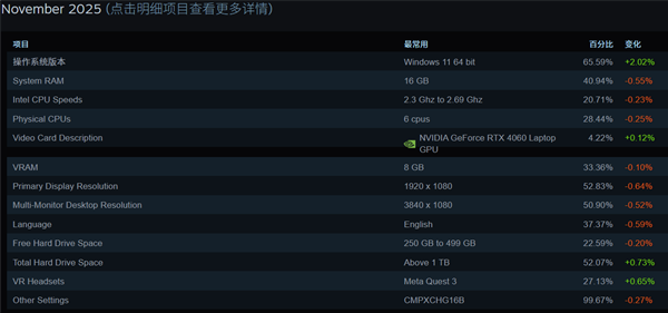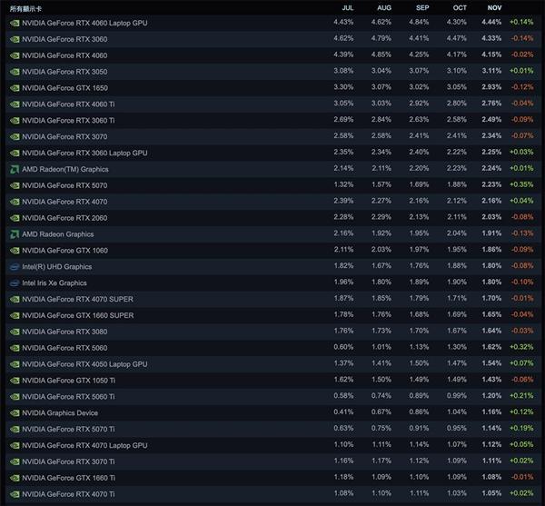 而RTX 5050,以及AMD的RX 9070和RX 9060系列,在11月份的调查中依旧不见踪影;另外显卡前两名也发生变化,RTX 4060 Laptop与RTX 3060再次互换了位置。