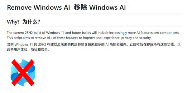 zoicware开发了一个名为"RemoveWindowsAI"的脚本,顾名思义,该脚本能够清除Windows 11中所有主要的AI功能,并提供指引帮助用户手动禁用其他需要手动干预的AI组件。