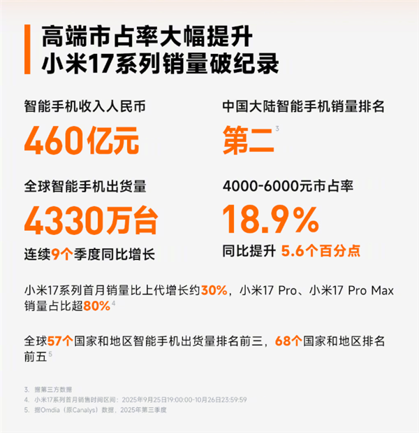 根据小米此前发布的第三季度财报显示,小米高端化战略取得新突破,Q3国内智能手机销量排名第二,其中4000-6000元价位段市占率18.9%,同比提升5.6个百分点。