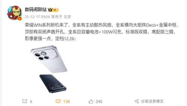 12月17日消息,荣耀WIN系列今天正式官宣定档,将于12月26日正式发布。