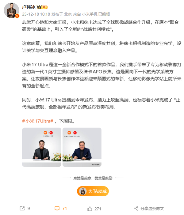 小米17 Ultra下周登场!卢伟冰:小米正代高端旗舰全部当年发布