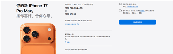 iPhone 17 Pro Max相对抢手,目前仅顶配2TB版本有现货,但当天下单,第二天也能送达。