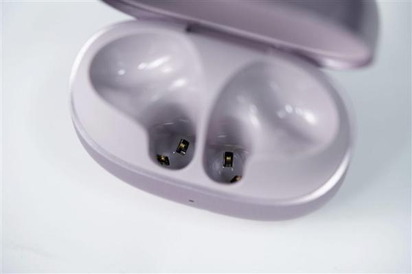 耳机盒纤薄小巧,形似天然鹅卵石,单只重量4.4g,采用仿生曲线设计,耳杆衔接处收窄12%,不硌耳屏,出音嘴减薄11.3%,不顶耳道。