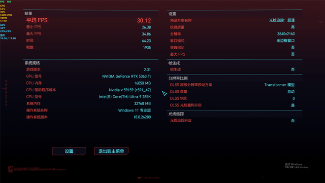 在《赛博朋克:2077》中,我们使用"光线追踪:超速"预设,并在DLSS中选择Transformer模型,DLSS超分辨率使用默认的自动,在4K分辨率下,运行自带的性能测试。