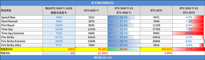映众RTX 5060 Ti 16GB超级冰龙显卡是我们测试过的最强的RTX 5060 Ti,理论性能测试中对比上代同级的RTX 4060 Ti,成绩大幅提升了约30%,对比上代RTX 4070,也只剩下最后3%的差距,甚至在个别项目中能做到反超,非常惊人。