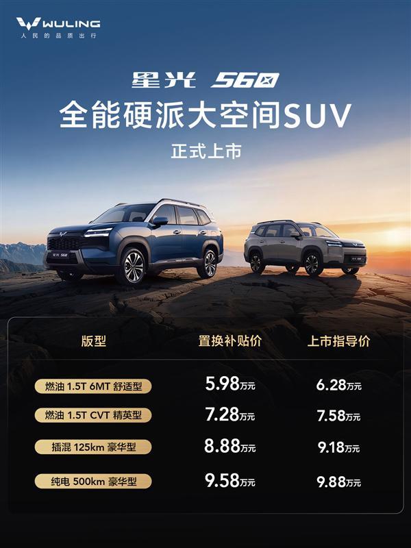 1月16日消息,昨晚,五菱"全能硬派大空间SUV"星光560上市,共推出4款车型,涵盖燃油、插电和纯电三种动力,售价区间6.28-9.88万元,置换补贴价为5.98-9.58万。