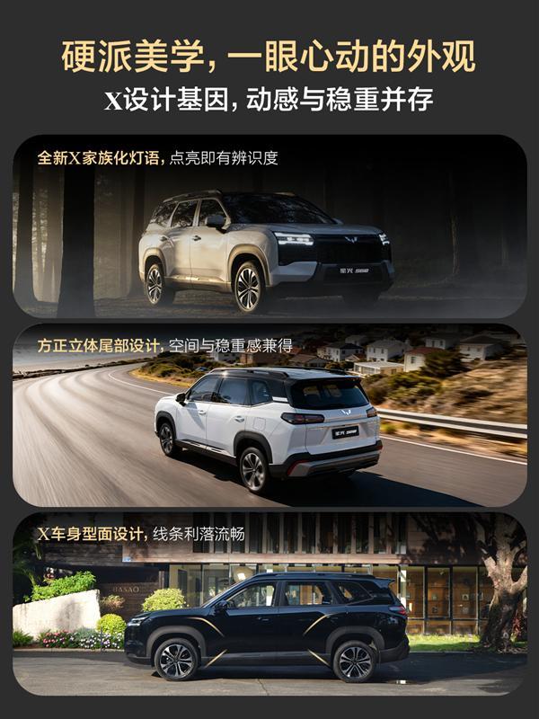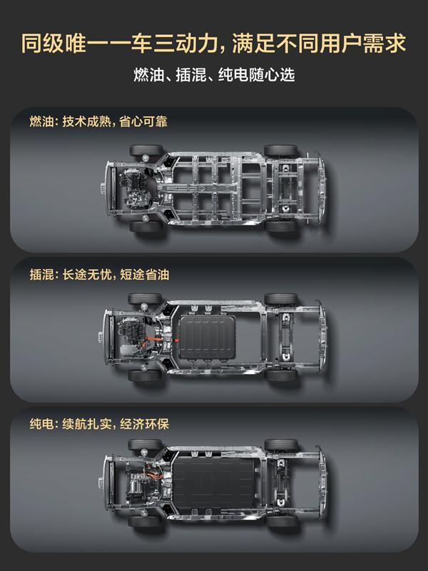 燃油以及插电混动版采用矩形网状格栅,下包围则通过梯形防擦护板展现硬朗风格;纯电动版车型则是配备封闭式格栅+矩形通风口的组合,全系标配LED大灯,其采用双横线式设计,点亮后具有不错的辨识度。