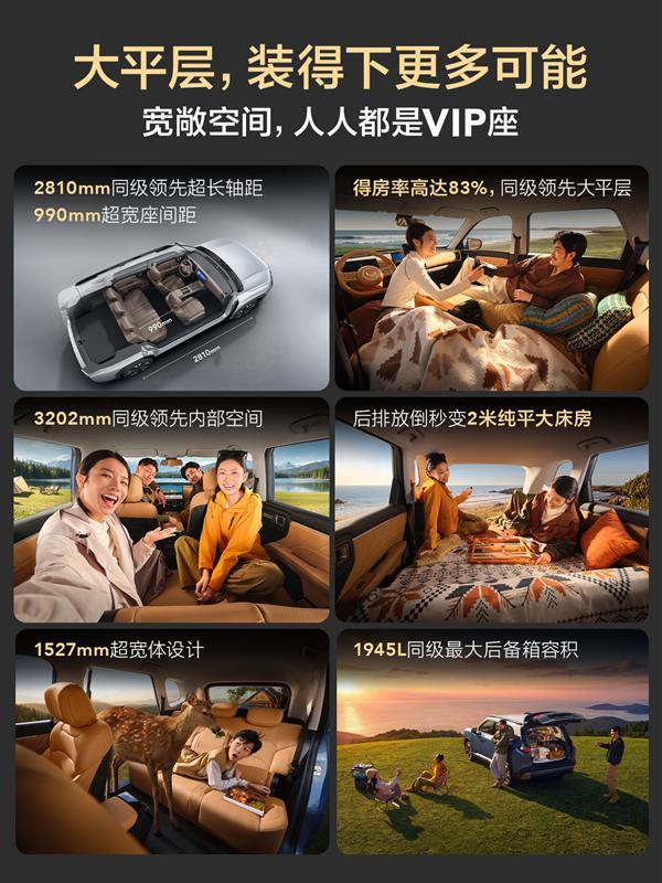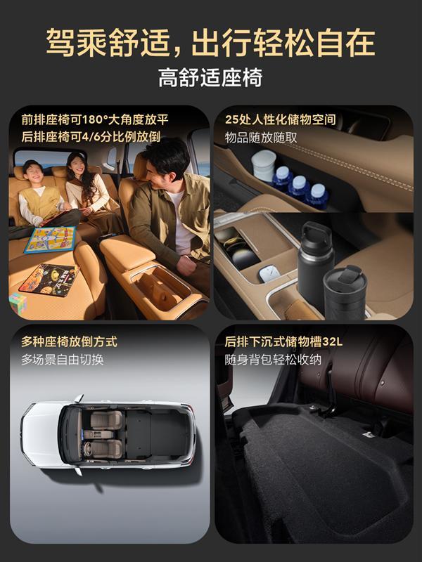 新车提供大五座和七座两种座椅布局,前排座椅靠背支持放平,和二排能够形成一个可供临时休息的平整空间,第二排座椅也可支持靠背调节和4/6比例分割放倒,且靠背角度最大支持128°。