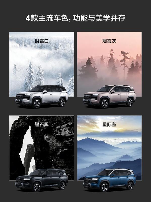 该车基于天舆架构D平台打造,在外观方面基本保留了宏光侠概念车上硬朗风格,提供星际蓝、烟霞灰、银霜白和耀石黑四种颜色可选。