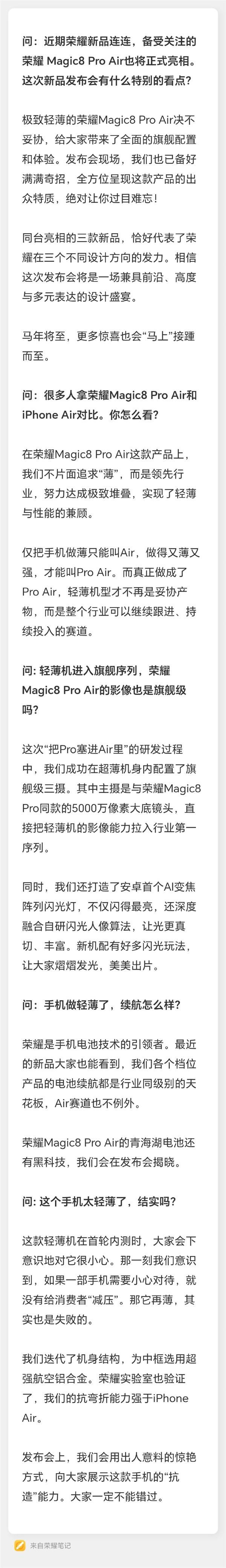 对于如何看待很多人将荣耀Magic8 Pro Air与iPhone Air对比的问题,方飞表示,在荣耀Magic8 Pro Air上,荣耀不片面追求"薄",而是领先行业,达成极致堆叠,实现轻薄与性能兼顾。