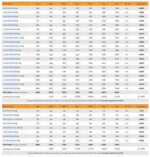 2x16GB DDR6-6000规格价格涨幅最大,因为它们起始价格最低,价格已从去年7月的75欧元猛涨至395欧元,涨幅高达427%。