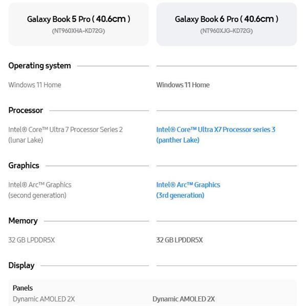 根据官方对比数据,新款Galaxy Book 6 Pro(型号NT960XJG-KD72G)作为去年Book 5 Pro的直接继任者,其处理器从8核的Lunar Lake升级到了16核的Panther Lake,但在其他核心配置上几乎原地踏步,同样是32GB LPDDR5X内存和1TB存储。