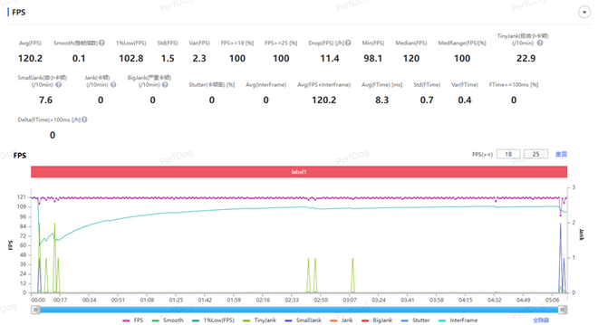 在《王者荣耀》中,开启极致画质120帧,一局5v5的游戏全程都能保持120Hz,只在最后游戏结束时的固定演出有轻微的帧率波动,整体表现极为稳定。