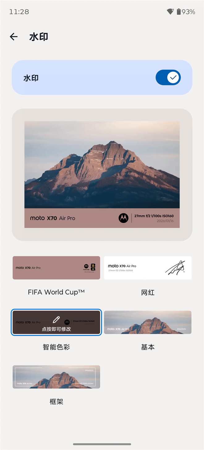 照片水印现在也是提升照片格调的重要手段,精美的水印不但可以标记照片的拍摄时间和参数,也是用户展示自身审美的一个窗口,现在各家品牌也都很重视相机水印的设计,联想moto X70 Air Pro也不例外,提供了5种不同的水印方案。