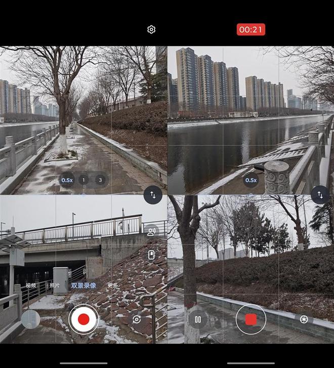在相机的更多模式选择中,最后一个图标就是双景录像功能,开始后用户可以同时使用前置和后置摄像头,进行同时拍摄录像,并且在布局选择中,也可以选择大小屏幕套嵌或上下等分屏幕。