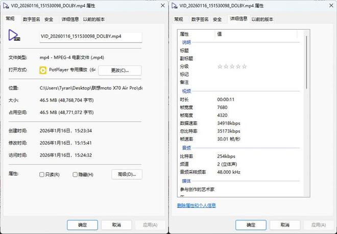 从文件属性中可以直接看到,视频的分辨率为7680 x 4320,11秒的视频文件体积约为46MB。