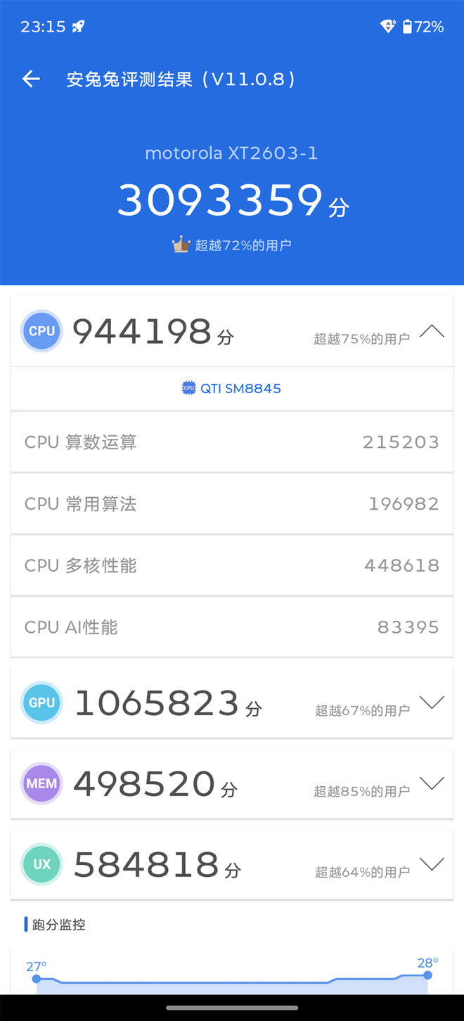 联想moto X70 Air Pro的性能方面也称得上Pro,第五代高通骁龙8处理器,安兔兔跑分超过300万。