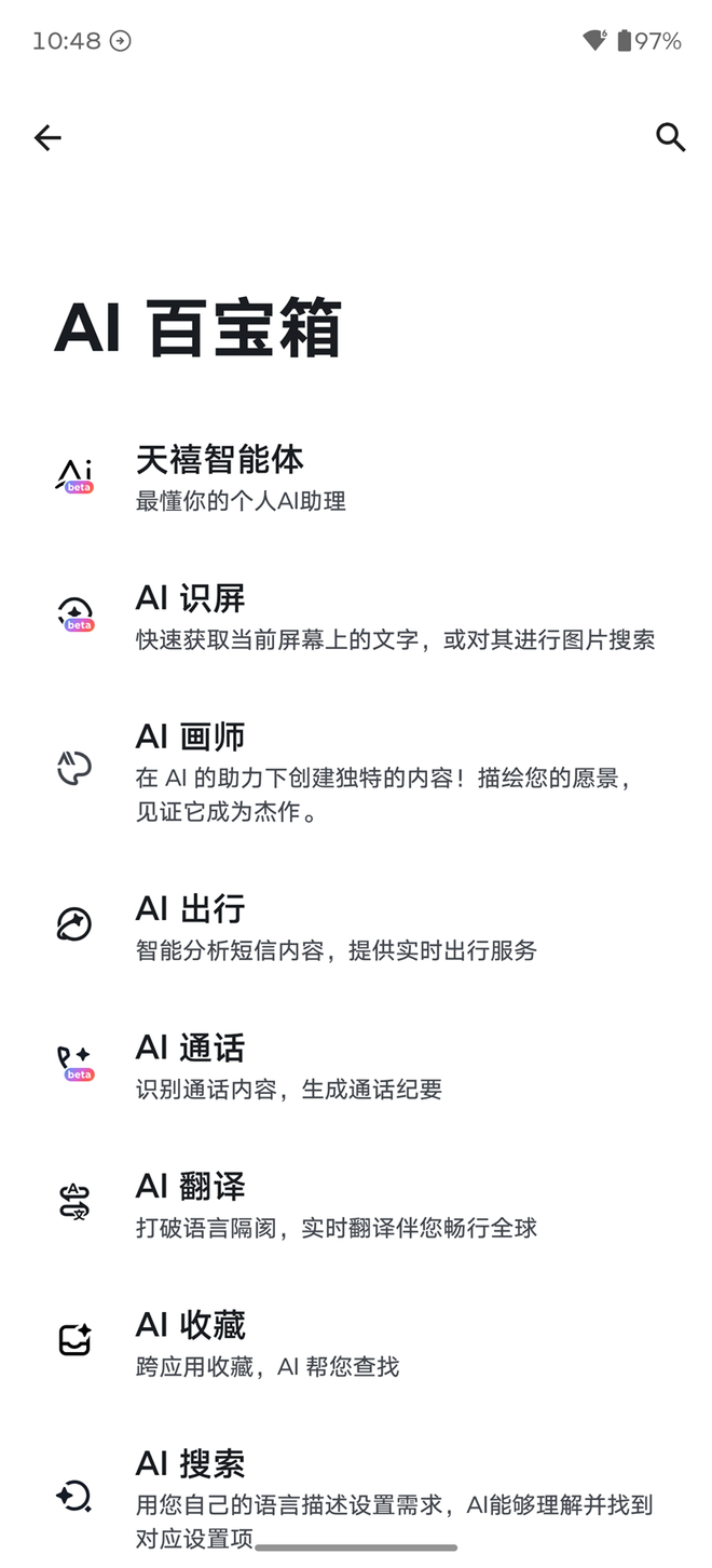 排在第一位的天禧AI,相当于最佳队友,所有的AI功能都可以通过它来调用。