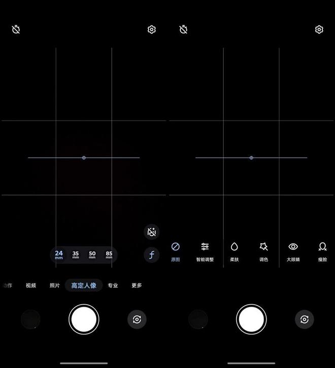 在高定人像模式中,镜头焦距会直接标出毫米数字,更方便用户理解使用,可以一键选择更适合特写的85mm黄金人像焦距或者35mm人文焦距。另外在高定人像模式中,还提供了丰富的美颜滤镜调节选项,但默认是关闭美颜的原图,有这方面需要的用户可以手动启用。