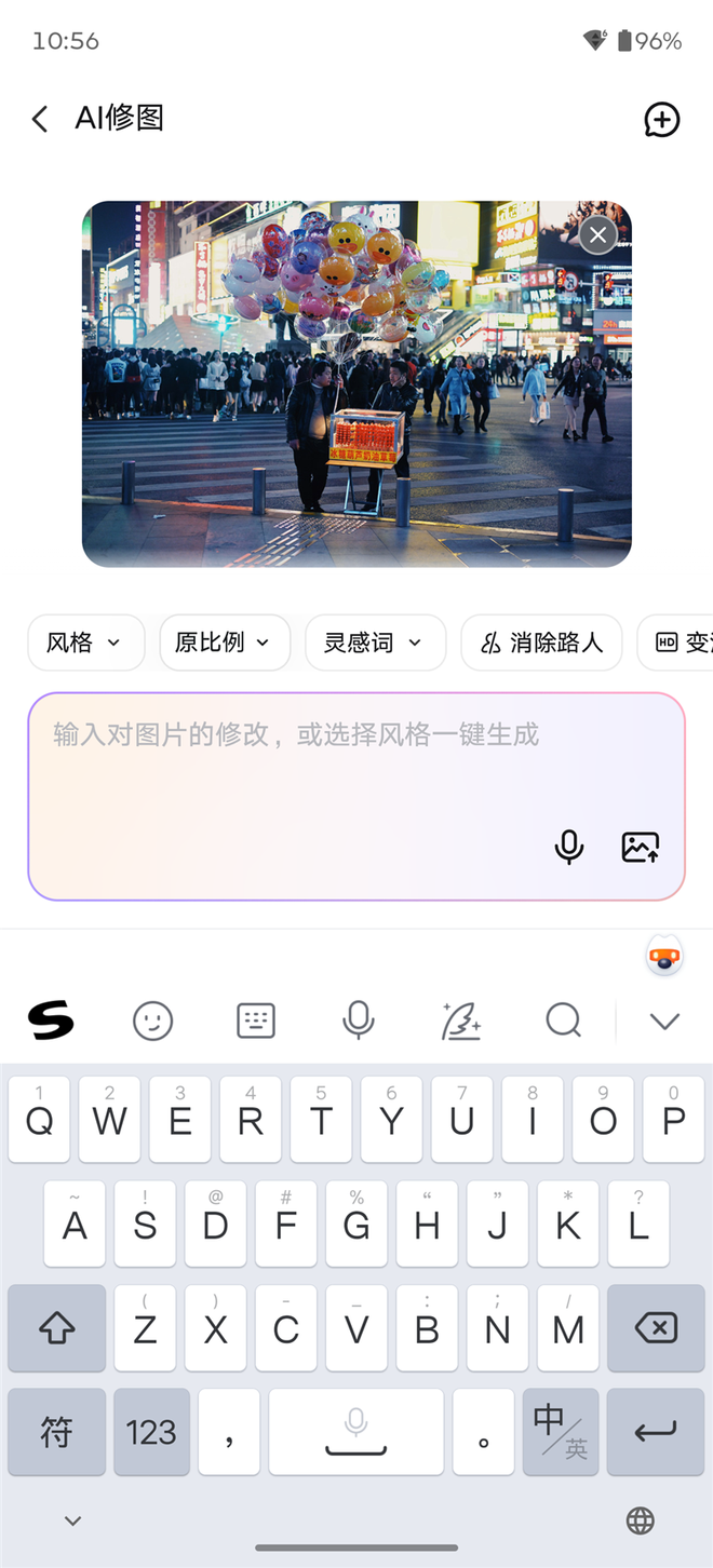 我们简单测试了一下AI修图功能,可以看到联想moto X70 Air Pro直接提供了很多快捷指令,例如去除路人和高清化等,也提供了很多灵感词,相当于AI生图时的提示词,方便用户直接选取使用。