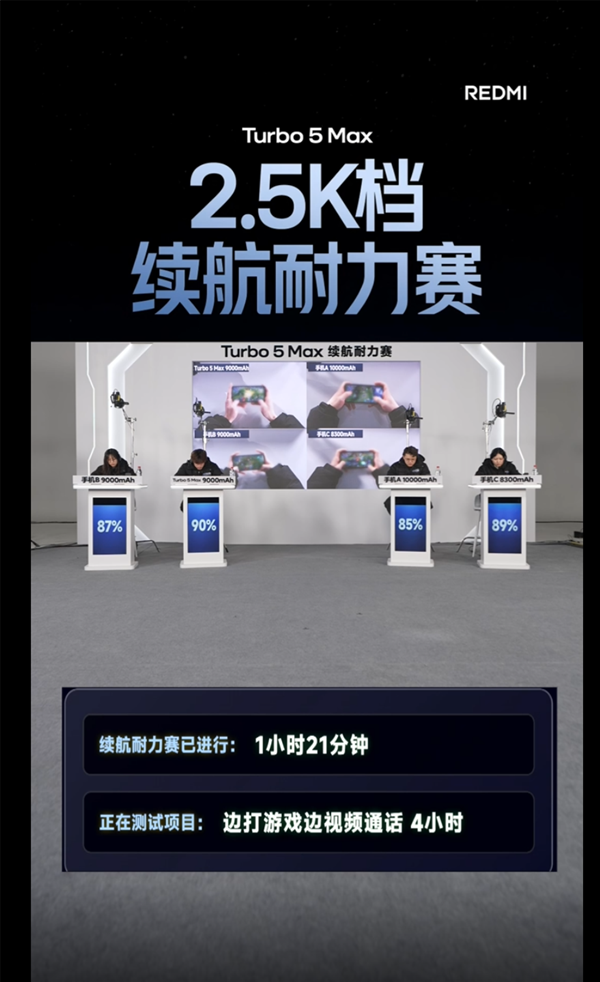 1月20日消息,REDMI宣布,2.5K档续航耐力赛正式开赛,REDMITurbo 5 Max以9000mAh迎战友商10000mAh,实测游戏、视频等重载场景,在相同环境、条件同时开测,不关机不下播。