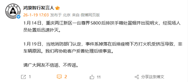 1月19日消息,刚刚,鸿蒙智行发言人就近日网传的"尊界S800自燃起火"一事进行回应: