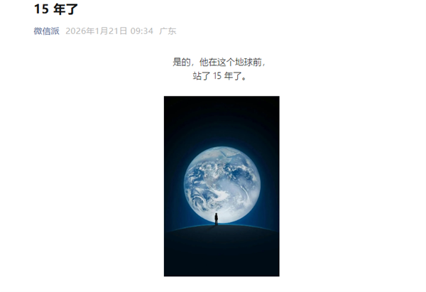 1月21日消息,据微信派公众号介绍,今天是微信15周岁生日,2011年1月21日,微信正式上线。