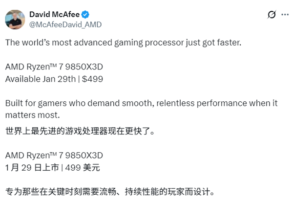 1月23日消息,AMD官方宣布,其最新的Zen 5架构桌面游戏处理器锐龙7 9850X3D 将于1月29日正式上市,售价为499美元。