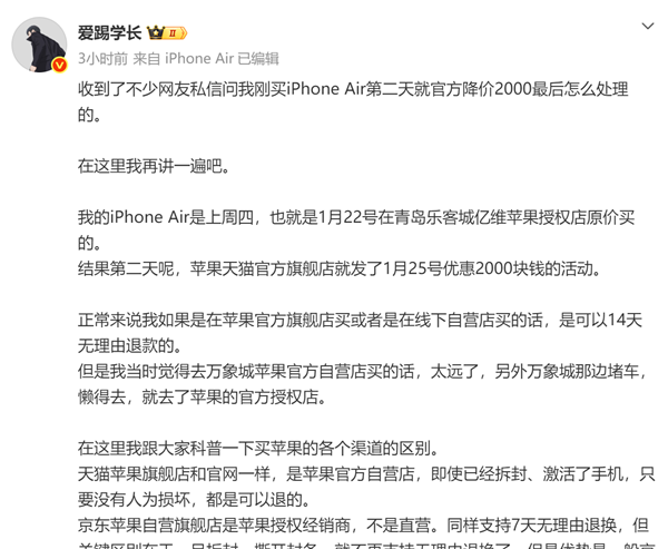 1月26日消息,这可能是国内最倒霉的果粉了,刚买的iPhone Air,第二天就遇到了官方2000元的降价,且不能退还差价。