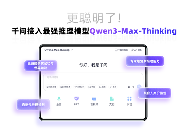即刻体验千问PC和网页端接入的国内最强推理模型Qwen3-Max-Thinking,这款模型拥有卓越的智能推理能力,为用户提供快速、精准的回答和解决方案,通过PC和网页端接入,用户可以随时随地享受智能问答、知识推理等服务,提升工作效率和生活品质,即刻体验,开启智能生活新篇章!