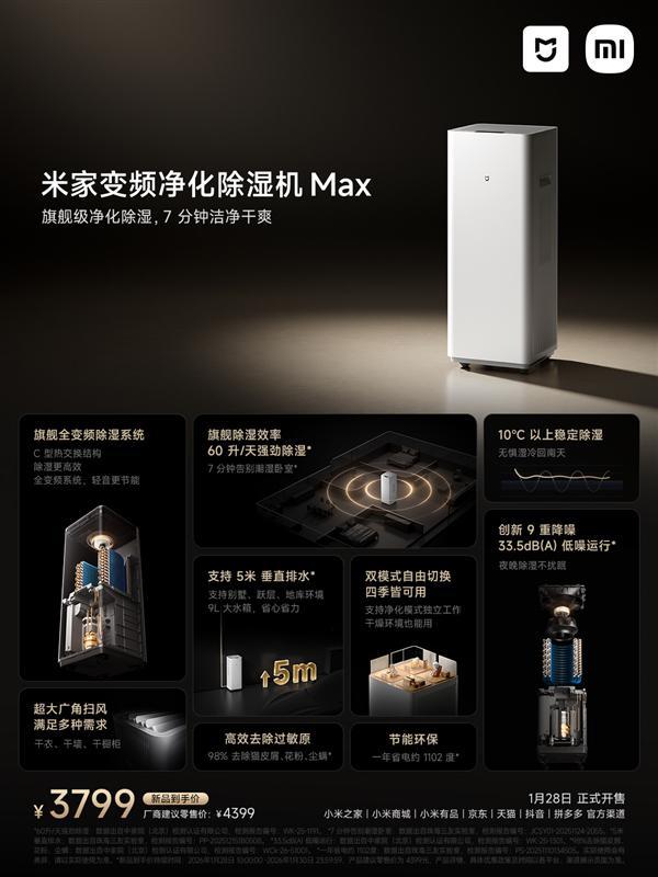 1月22日消息,小米最新发布的米家变频净化除湿机Max今天正式开售,首发到手价3799元。