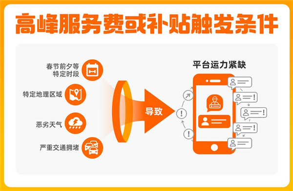 此外,除了国庆、元旦、春节前夕等特定时间段,在一些运力紧缺的地理区域,或者遇到暴雨、暴雪等恶劣天气,又或是严重交通拥堵等导致订单匹配难度增加的时候,系统也会自动激活智能补贴/高峰服务费策略。